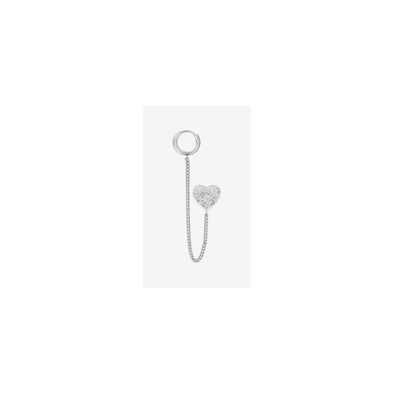 Mono orecchino donna in acciaio con cuore con cristalli bianchi. Lunghezza: 5 cm. Dimensione cuore: 12 mm. Diametro cerchio: 12 mm.