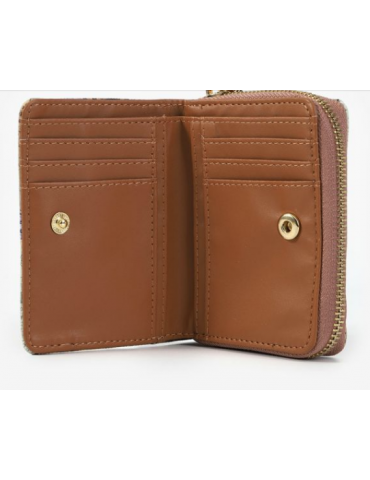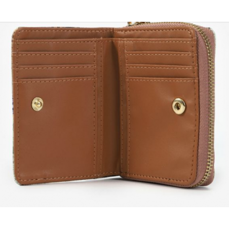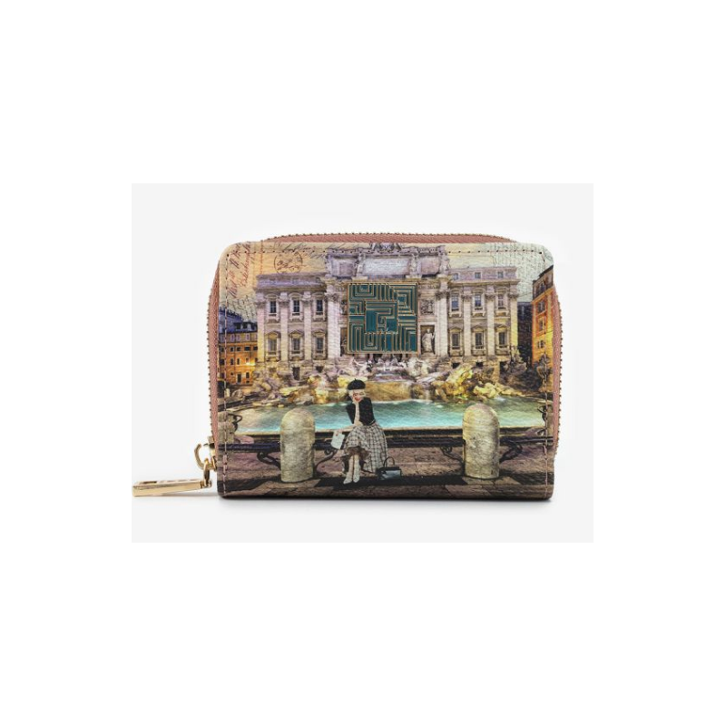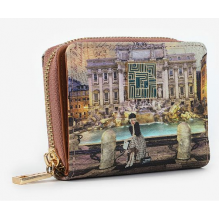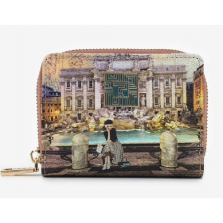 Il portafogli da donna firmato Y-Not, della collezione autunno/inverno, è realizzato in similpelle. Il modello con patta presenta una chiusura con bottoncino automatico, comparto esterno con zip per monete e, internamente, uno scomparto e due porta carte. La fantasia, in tipico stile Y-Not, raffigura Roma e il portafogli è impreziosito da un inserto in metallo nella parte frontale.
