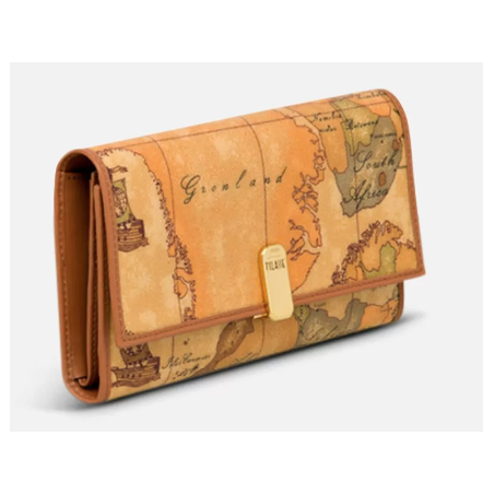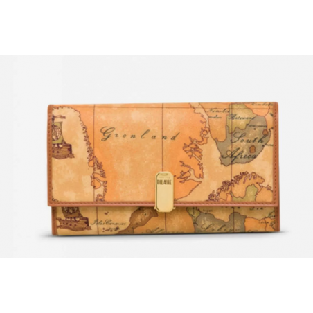 Portafogli donna in tessuto stampato con cartina geografica Geo Classic, con numerosi scomparti per banconote, documenti e carte di credito, comoda tasca portamonete chiusa con bottone a pressione, chiusura con clip dorata con logo 1AClasse. Grazie alle sue grandi dimensioni e alla linea compatta, potrai portare sempre con te tutto ciò che ti serve.