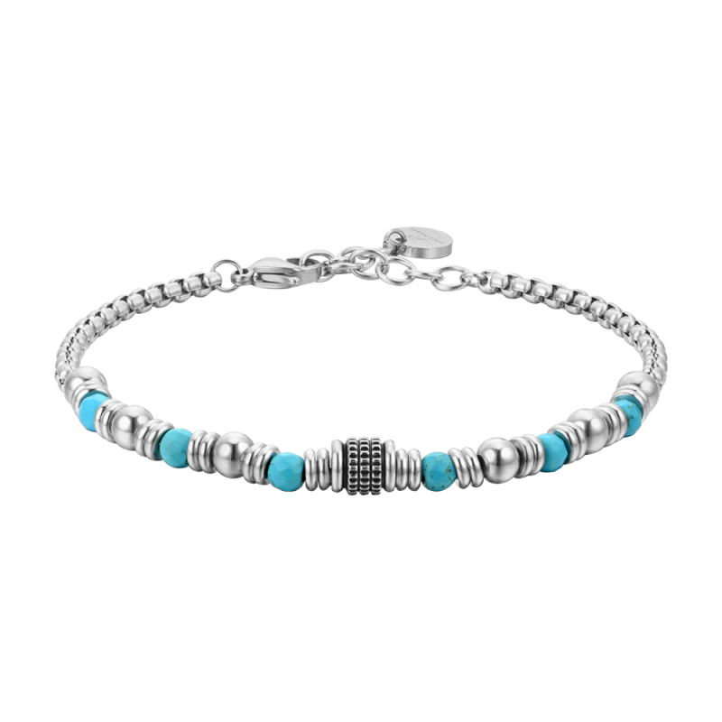 Bracciale Uomo in acciaio con pietre turchesi ed elementi in acciaio. Lunghezza: 19 + 3 cm. Diametro pietra: 4 mm. Spessore catena: 3 mm. Le pietre turchesi, con il loro colore distintivo e la tradizione di portare fortuna, sono spesso associate alla protezione e alla prosperità. Gli elementi distintivi in acciaio aggiungono un tocco moderno ed elegante al design complessivo del bracciale.