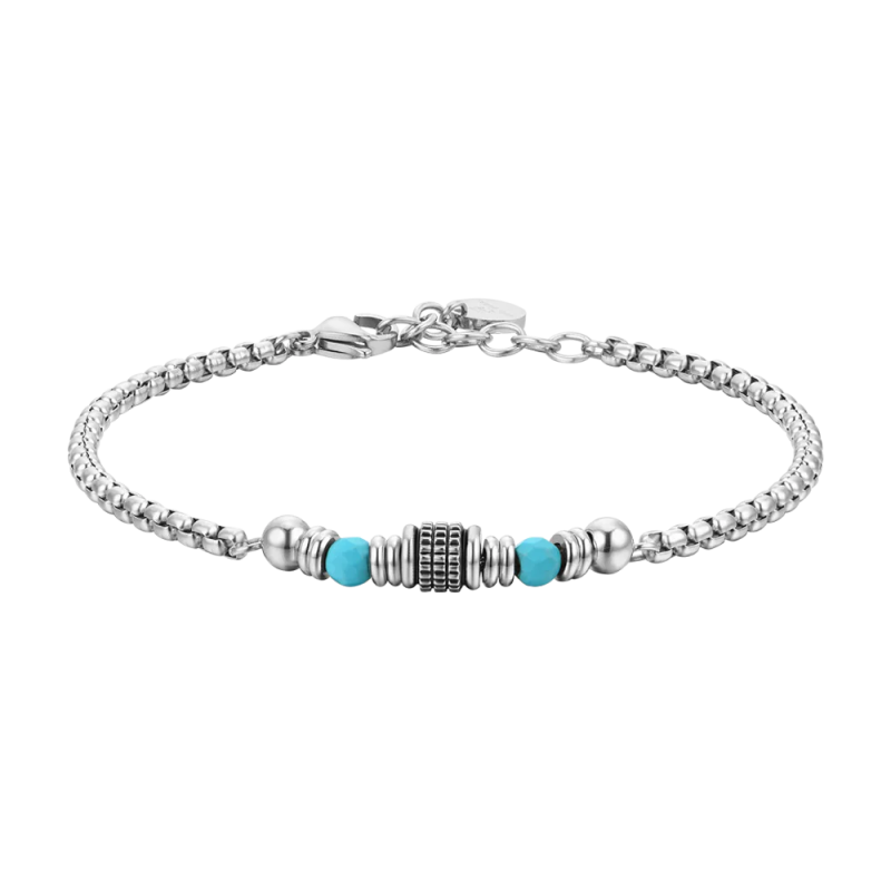 Bracciale Uomo in acciaio con pietre turchesi ed elementi in acciaio. Lunghezza: 19 + 3 cm. Diametro pietra: 4 mm. Spessore catena: 3 mm. Le pietre turchesi, con il loro colore vibrante e la storia di essere considerate portafortuna, sono spesso associate alla protezione e alla fortuna. Gli elementi distintivi in acciaio aggiungono un tocco moderno ed elegante al design complessivo del bracciale