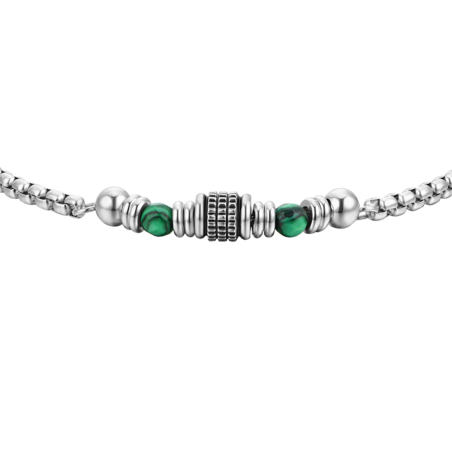 Bracciale Uomo in acciaio con pietre malachite verde ed elementi in acciaio. Lunghezza: 19 + 3 cm. Diametro pietra: 4 mm. Spessore catena: 3 mm. Le pietre malachite verde, con la loro sfumatura unica e la connessione alla natura, sono spesso associate alla prosperità e alla protezione. Gli elementi distintivi in acciaio aggiungono un tocco moderno ed elegante al design complessivo del bracciale.
