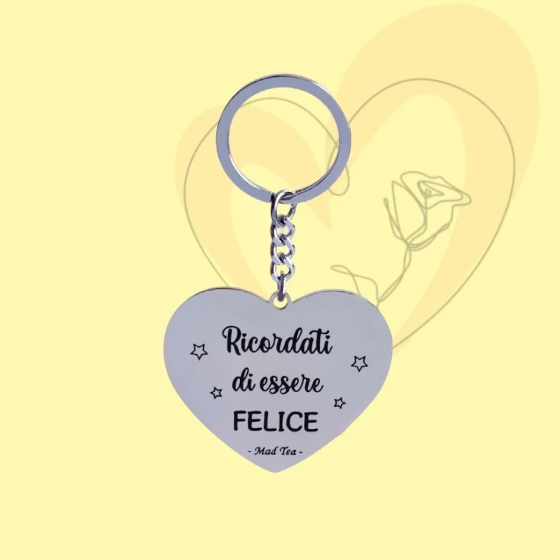 Portachiavi a forma di cuore con incisa la frase “Ricordati di essere felice” e piccole stelline smaltate.