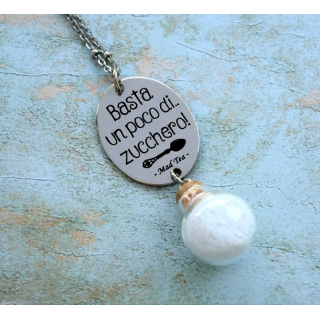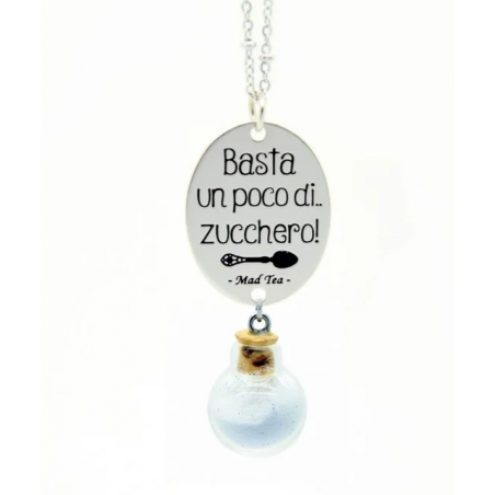 Collana composta da ciondolo con incisa la frase “Basta un poco di zucchero” e un piccolo cucchiaino inglese e una simpatica boccetta contenente lo zucchero magico.