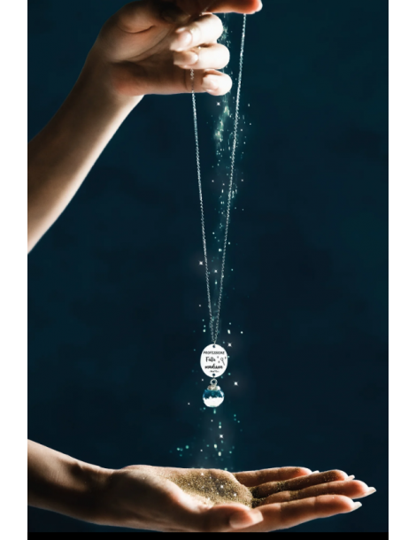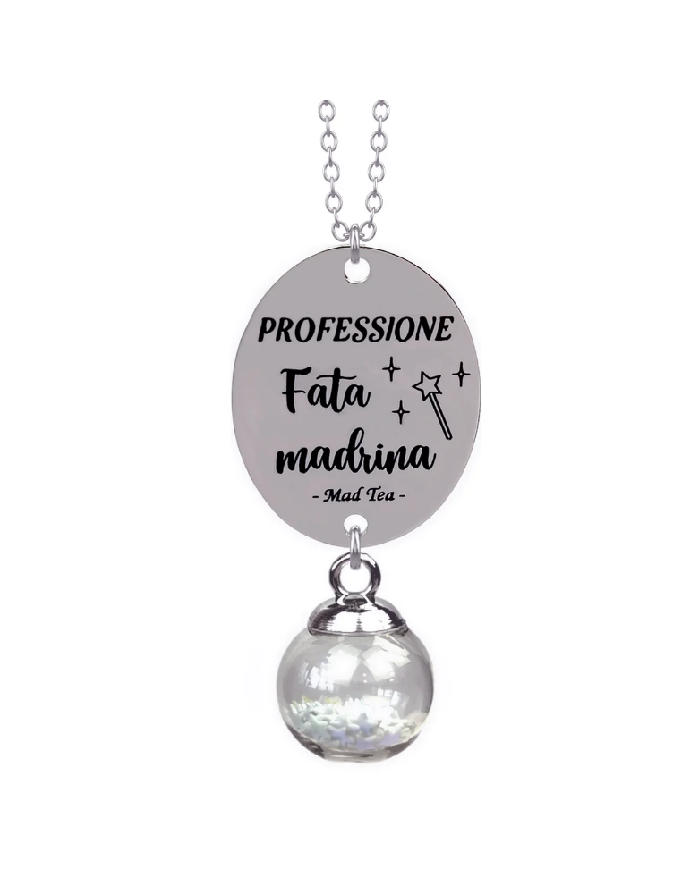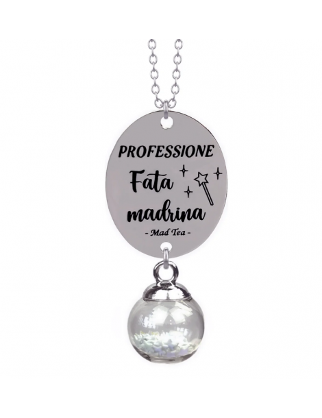 Collana con piccola boccetta contenente vera polvere magica e targhetta con incisa la frase “PROFESSIONE Fata madrina”.
