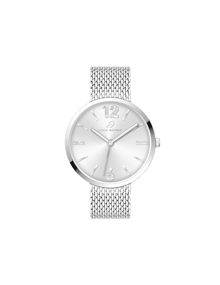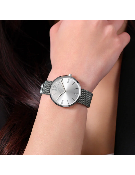 Orologio Donna in acciaio con cinturino maglia milano e chiusura magnetica e quadrante con cristalli bianchi. Diametro cassa: 35 mm. Movimento Miyota, 5 ATM. Solo Tempo. Esprime la tua eleganza senza tempo con il nostro Orologio da Donna in Acciaio con Cinturino a Maglia Milano e Quadrante Incastonato di Cristalli Bianchi. Con un diametro della cassa di 35 mm, questo orologio unisce stile e raffinatezza in un'unica creazione raffinata. Il cinturino a maglia milano in acciaio offre una combinazione di comfort e raffinatezza, mentre il quadrante incastonato di cristalli bianchi cattura e riflette la luce con grazia e splendore. Questo accattivante contrasto aggiunge un tocco di glamour al tuo polso, mentre l'acciaio della cassa assicura durabilità e robustezza.