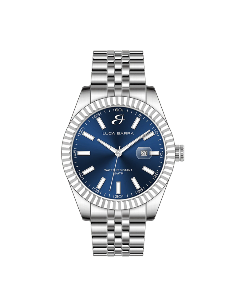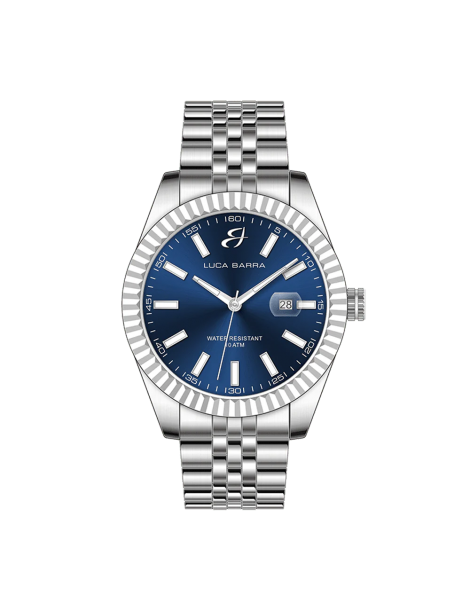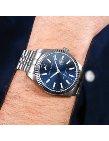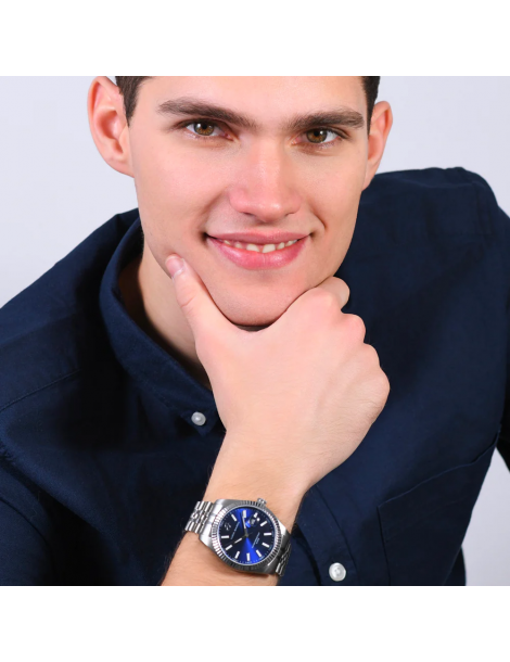 Orologio Uomo in acciaio con ghiera zigrinata e quadrante blu. Diametro cassa: 41 mm. Movimento Miyota, 10 ATM. Solo Tempo. La ghiera zigrinata aggiunge un tocco di raffinatezza e personalità, mentre il quadrante blu offre un'eleganza vibrante e sofisticata. L'acciaio della cassa e del bracciale conferisce robustezza e durabilità, adatto a qualsiasi situazione. Dotato del movimento Miyota, rinomato per la sua precisione e affidabilità, questo orologio offre un'esperienza di misurazione del tempo impeccabile