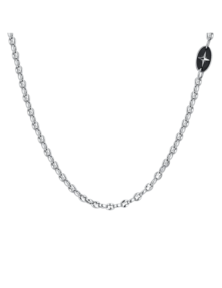 Collana Uomo in acciaio con elemento con smalto nero con rosa dei venti in acciaio. Lunghezza: 50 + 5 cm. Spessore catena: 4 mm. Misura elemento: 14 x 8 mm. La rosa dei venti è associata alla navigazione e all'avventura. Indossare una collana con una rosa dei venti simboleggia il desiderio di esplorare il mondo e di affrontare nuove sfide con coraggio e determinazione