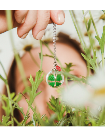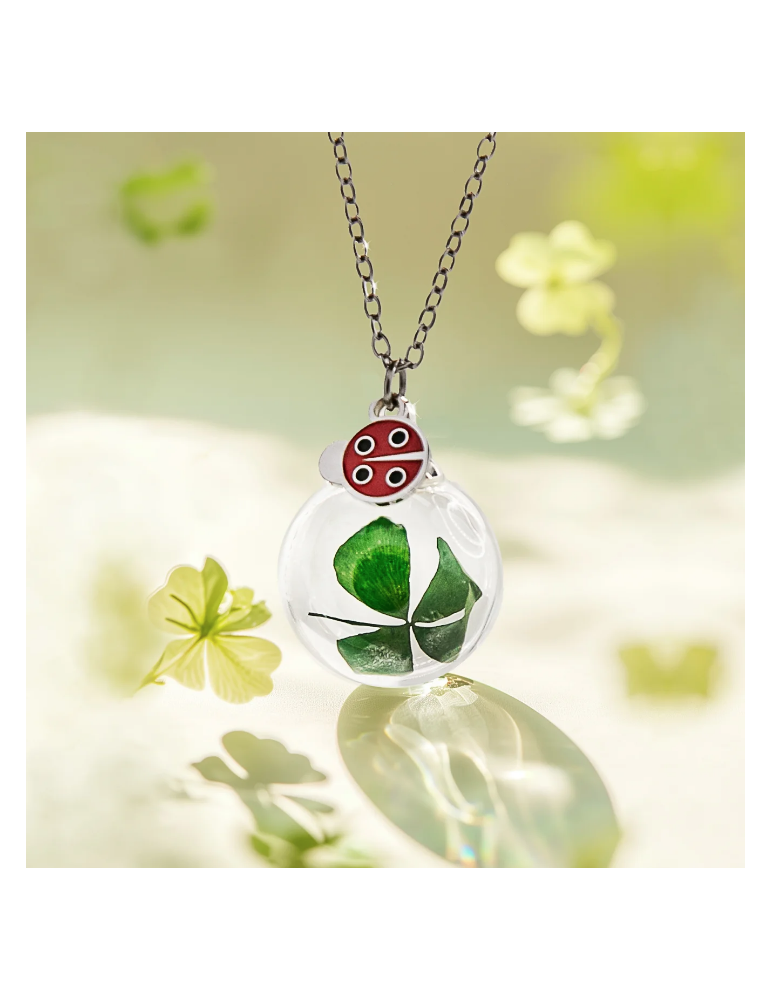 Collana con piccola sfera in vetro antiurto contenente veri quadrifogli essiccati e stabilizzati. Sulla sfera è montata una piccola targhetta in acciao double face con una piccola coccinella smaltata sul fronte e la parola “FORTUNA” incisa nel retro.