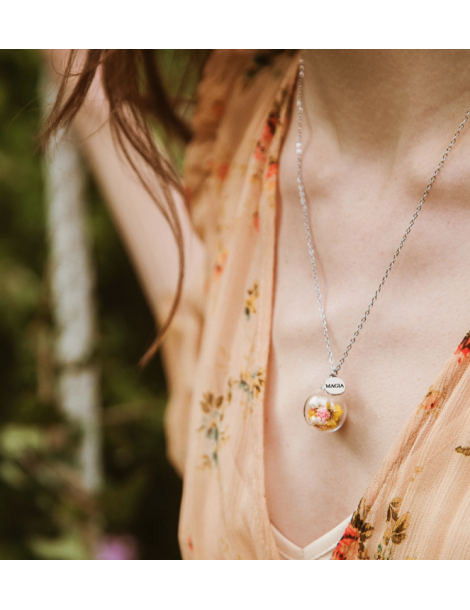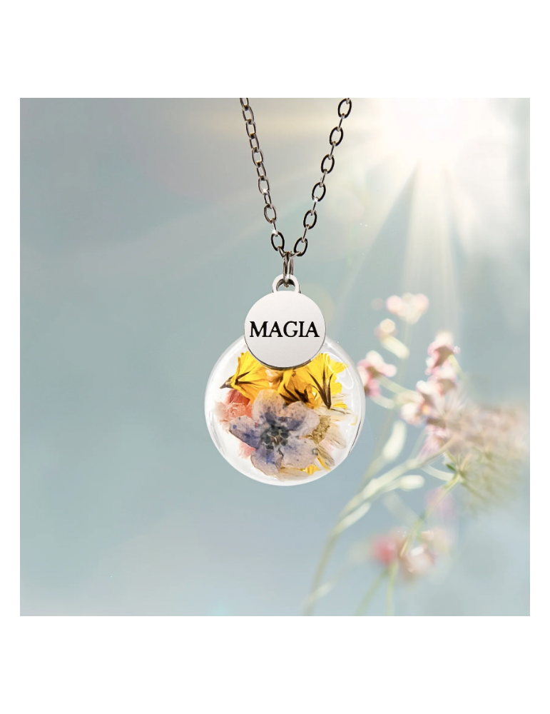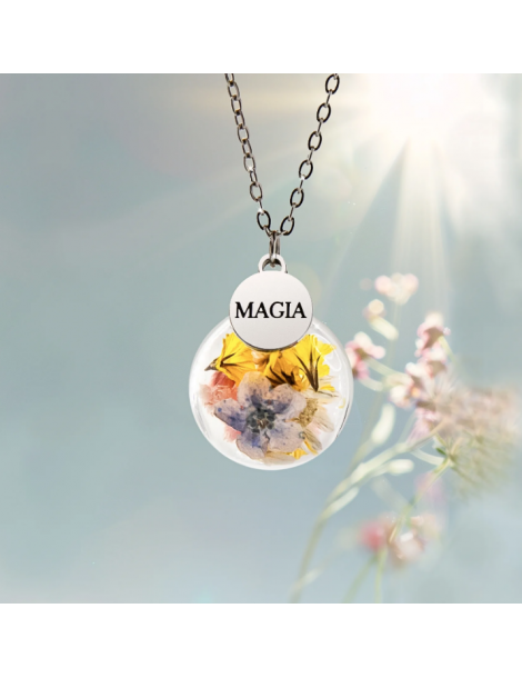 Collana con piccola sfera in vetro antiurto contenente veri fiori di campo essiccati e stabilizzati. Sulla sfera è montata una piccola targhetta in acciao double face con incisa la parola “MAGIA” sul fronte e un fiore di campo nel retro.