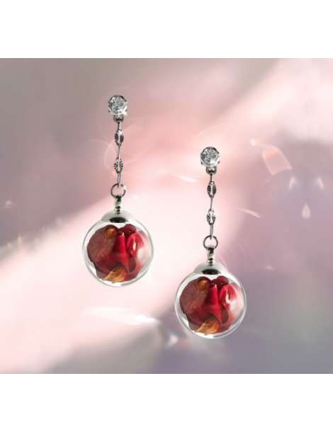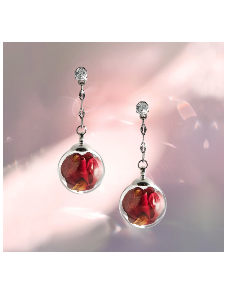 Orecchini con piccole sfere in vetro antiurto contenenti petali di rosa essiccati e stabilizzati. Montatura con catena diamantata in acciaio e cristallo a lobo.