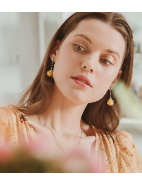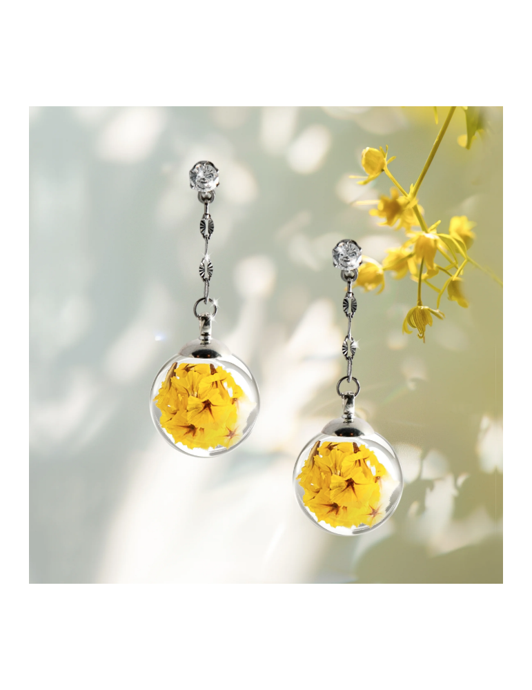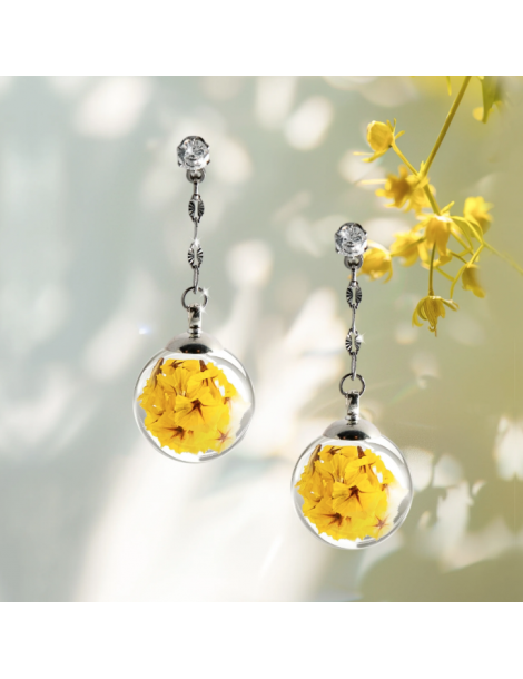 Orecchini con piccole sfere in vetro antiurto contenenti veri fiori di limonio essiccati e stabilizzati. Montatura con catena diamantata in acciaio e cristallo a lobo.