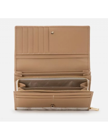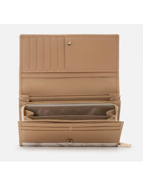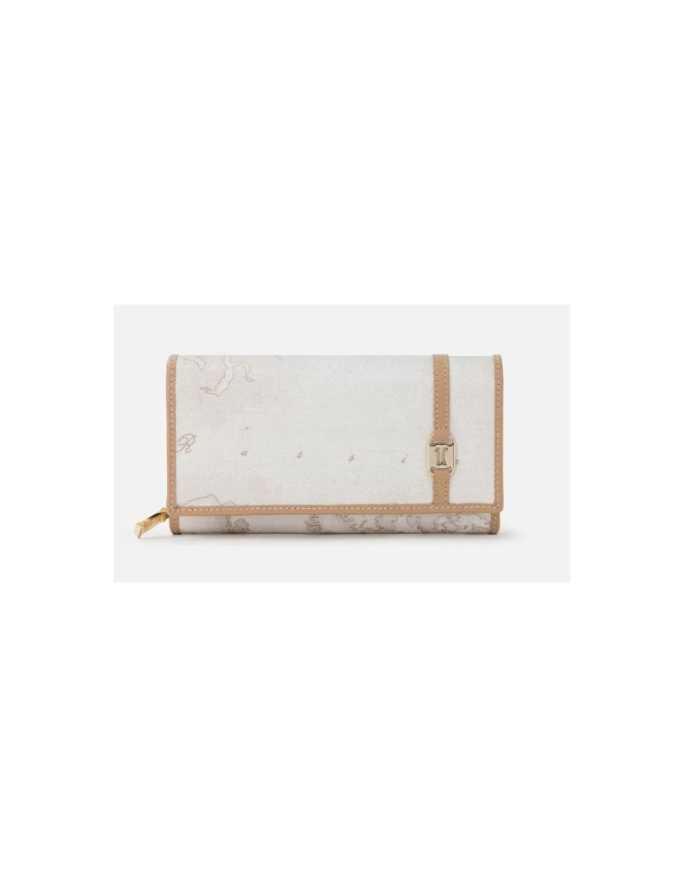 - Portafoglio grande con patta in tessuto Geo White con piastrina dorata 1C frontale