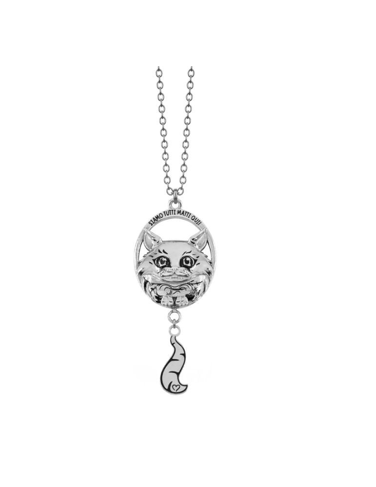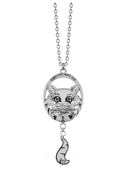 Collana con gatto di Alice con incisa la frase “Siamo tutti matti qui!” e la sua simpatica codona pendente.