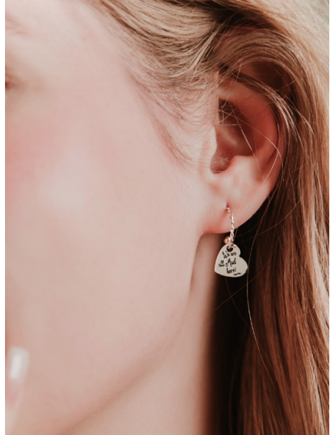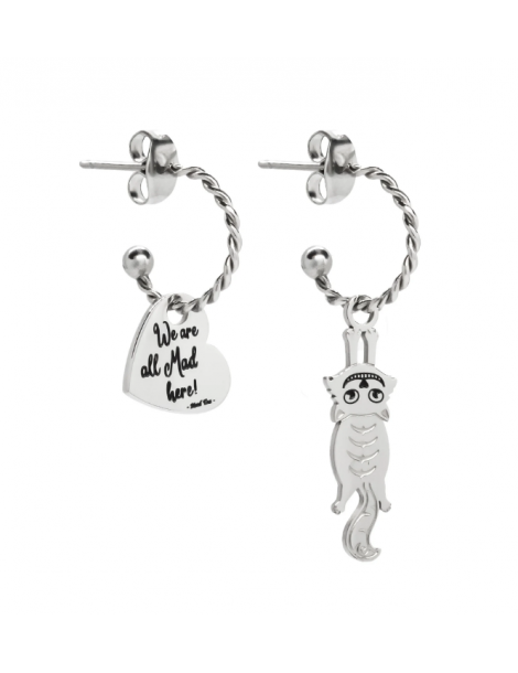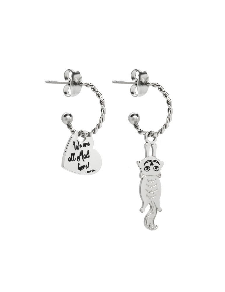 Orecchini con anelle con gatto di Alice appeso e ciondolo a forma di cuore con incisa la frase “We are all Mad here!” ossia “Siamo tutti matti qui!”.