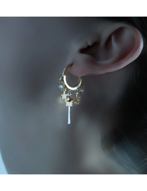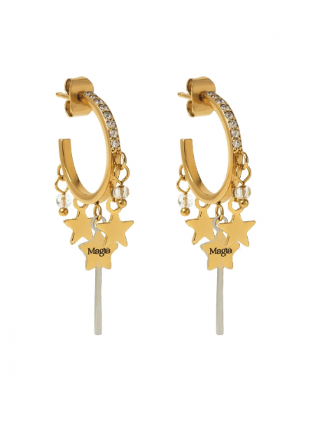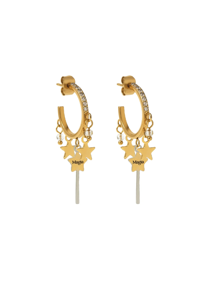 Orecchini a cerchio in acciaio dorato con bacchette magiche, cristalli e stelle di magia.