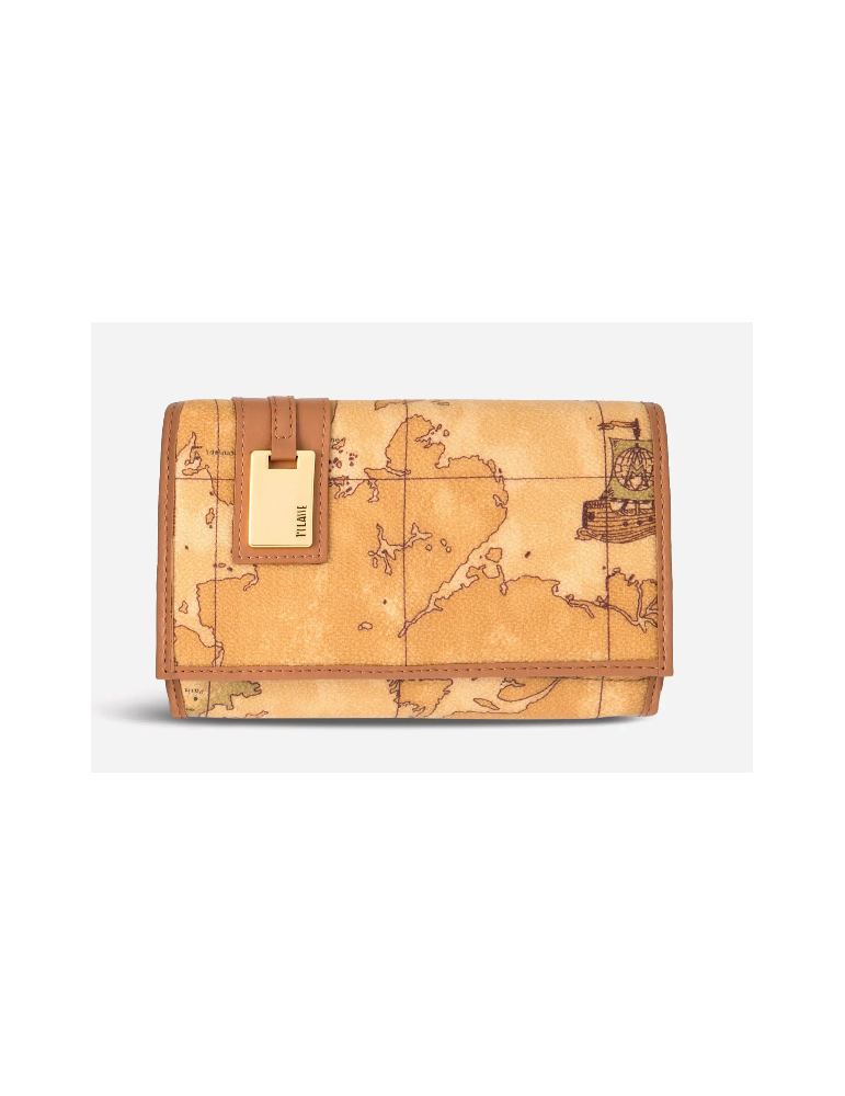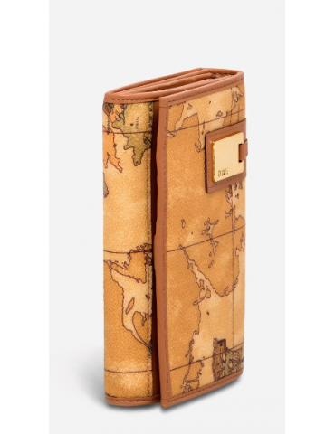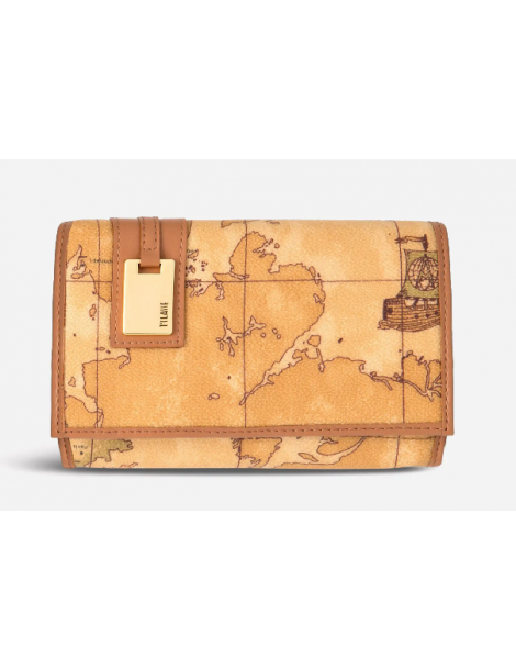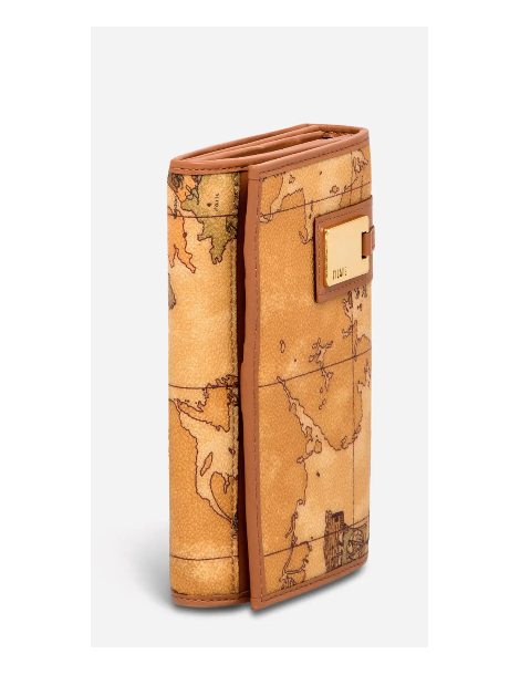 Portafogli donna in tessuto stampato con cartina geografica Geo Classic, con targhetta in metallo dorato con logo 1ᴬ Classe, tasca esterna con zip, numerosi comparti interni. Esclusivo e versatile, diventerà il tuo accessorio di punta da inserire in una delle borse di collezione.