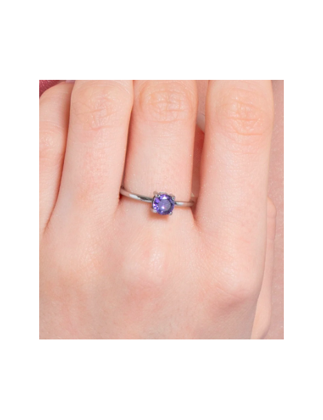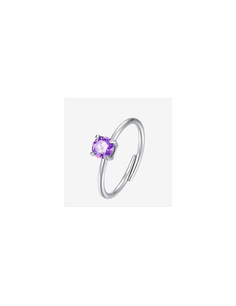 Anello donna in acciaio con zircone viola. Misura zircone 5 mm. Misura regolabile. Regalati un tocco di raffinatezza con questo anello in acciaio , decorato da uno scintillante zircone viola. Un gioiello che si distingue per il suo design romantico, perfetto per ogni occasione speciale.