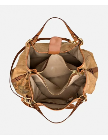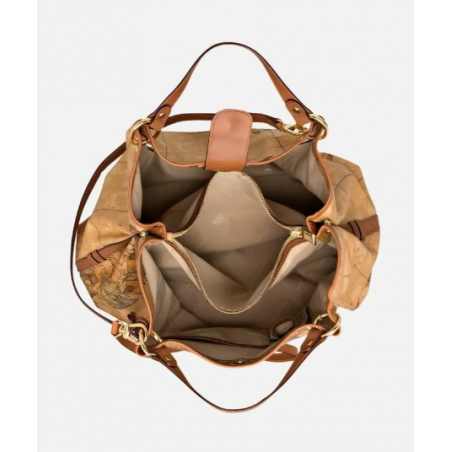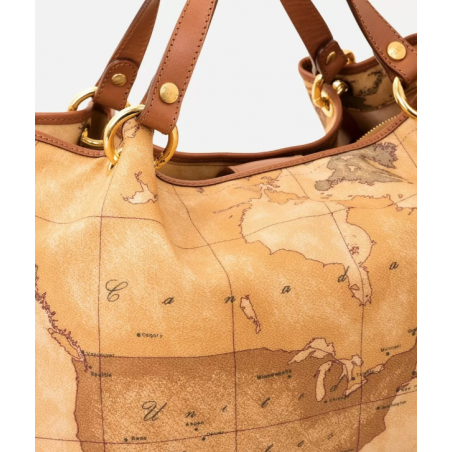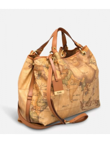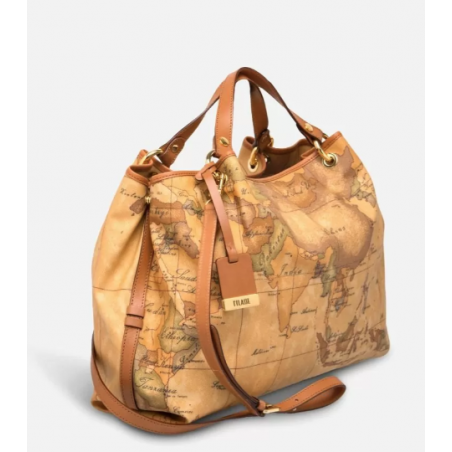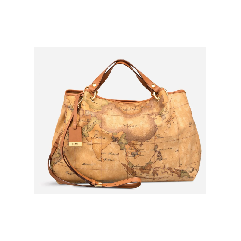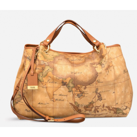 Borsa a mano in tessuto stampato con cartina geografica Geo Classic dalla doppia portabilità, a mano e a tracolla. Ha i manici e la tracolla regolabile e removibile in pelle e la chiusura con bottone a calamita. Il volume morbido e la cura dei dettagli tipici della lavorazione Made in Italy la rendono il completamento ideale dei tuoi outfit urbani. Disponibile in due misure.