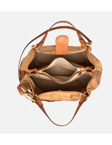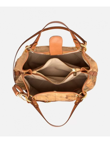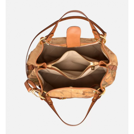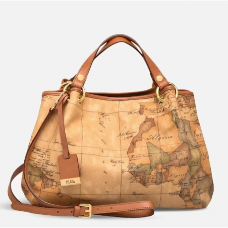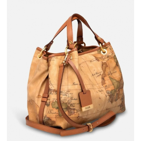 Borsa a mano in tessuto stampato con cartina geografica Geo Classic dalla doppia portabilità, a mano e a tracolla. Ha i manici e la tracolla regolabile e removibile in pelle e la chiusura con bottone a calamita. Il volume morbido e la cura dei dettagli tipici della lavorazione Made in Italy la rendono il completamento ideale dei tuoi outfit urbani. Disponibile in due misure.