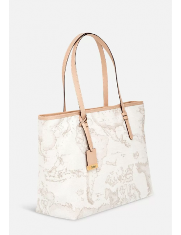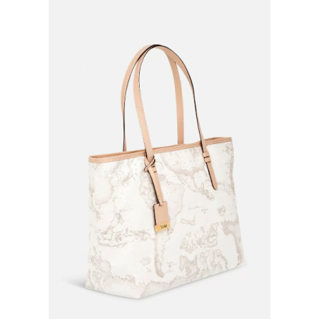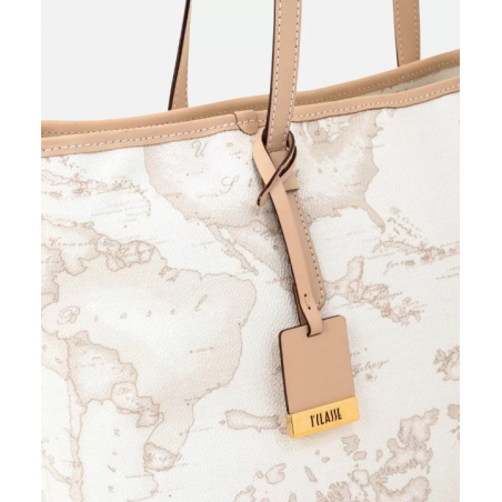 Borsa shopping in tessuto stampato con cartina geografica Geo White, con manici e dettagli in pelle di vacchetta, chiusura con zip, disponibile in due misure. La apprezzerai per la sua capienza e per il design lineare e contemporaneo.