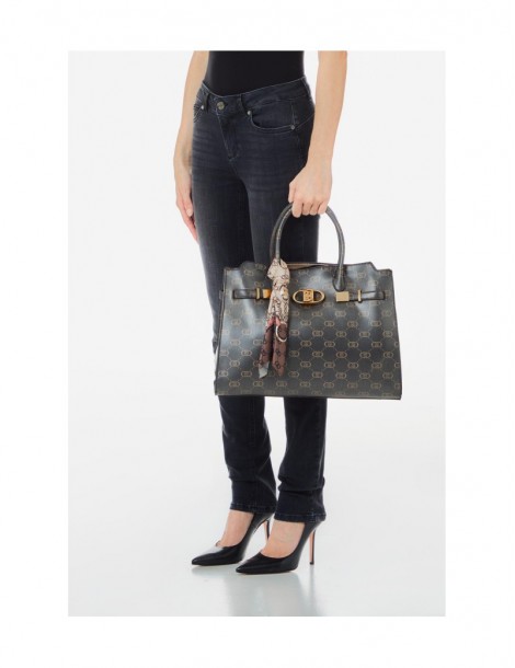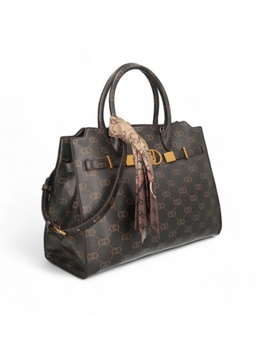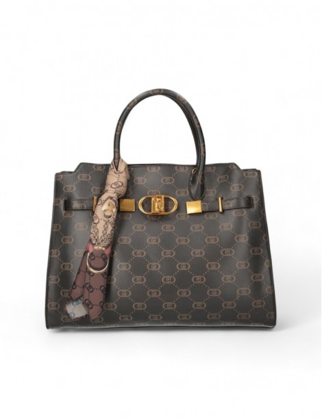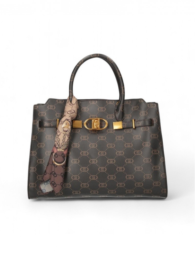 Borsa a mano con foulard. Borsa a mano in PU, foulard con logo stampato, comodo manico, tracolla regolabile e removibile. Motivo cintura con maxi fibbia logata in metallo sul davanti, due scomparti, scomparto con zip. Fodera interna con logo stampato, chiusura con bottone magnetico.