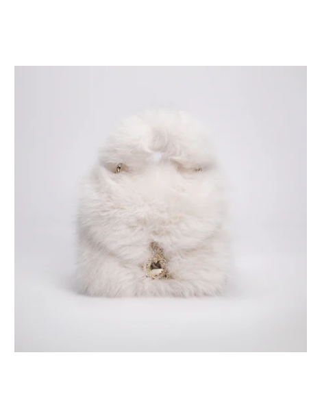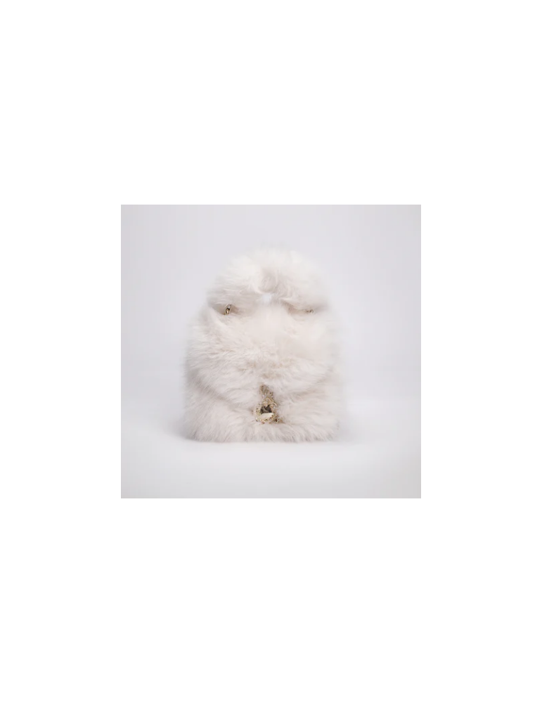 Mini bag in ecopelliccia con tracolla in catena ed ecoleather. La chiusura magnete è personalizzata con logo gioiello L'Atelier du Sac, impreziosito con strass e perle.