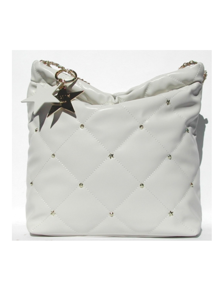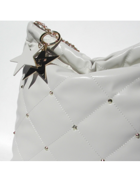 Secchiello L’Atelier Du Sac Rebel-Goldy Josette in pelle ecologica matelassè ultra leggera con logo, a mano, a spalla e a tracolla. Linea di punta del brand, questa proposta dal sapore rock mescola l’effetto matelassé alle borchie e alle catene. Chiuso con clip centrale. L’interno foderato è dotato di tasche portaoggetti una chiusa zippata. Finiture e charme in colore “gold”, Il ciondolo a forma di stella può essere usato come portachiavi.