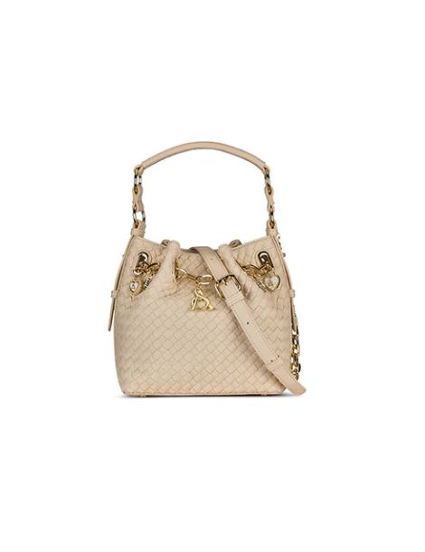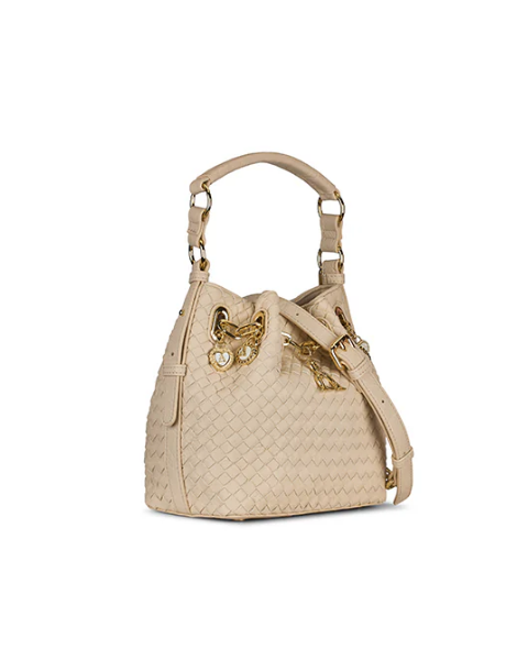 Borsa a secchiello con motivo intrecciato impreziosita da charm con logo L'Atelier du Sac. È dotata di manico in ecoleather e tracolla regolabile in catena ed ecoleather. Chiusura magnete.