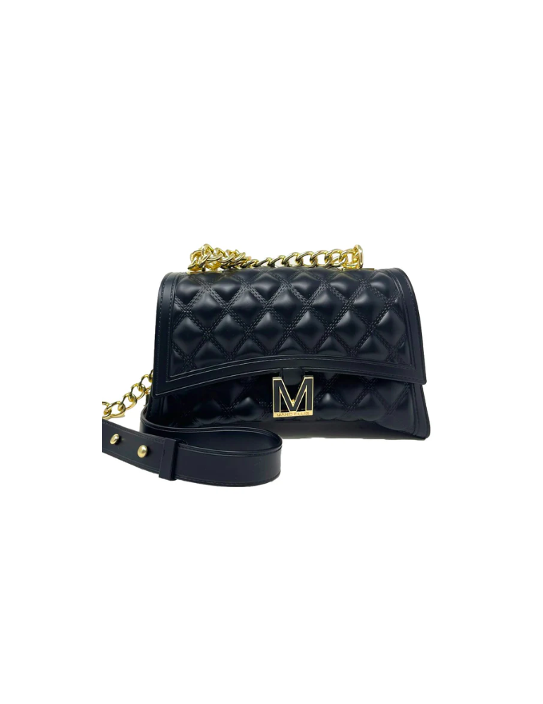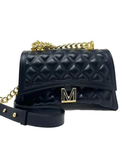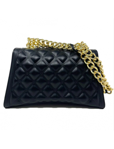 Borsa in pvc effetto trapuntato con chiusura a scatto con placca logo. Tracolla in catena e pvc regolabile. Dimensioni: 23 x 14 x 8 cm.