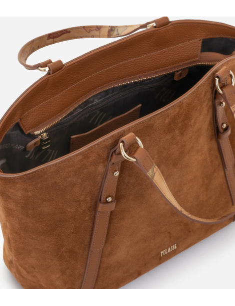 La borsa a mano Wild Leather interpreta i paesaggi della Scozia attraverso il mix di pelle scamosciata e granata, dall'effetto naturale e sofisticato. I due materiali esaltano diversamente i colori di Collezione, illuminati dall'oro chiaro del logo 1ᴬ Classe e della metalleria lungo gli attacchi dei manici: questi ultimi sono rifiniti sull'interno dalla stampa Geo Classic e si possono alternare nell'uso alla tracolla rimovibile. Il volume capiente e destrutturato valorizza la morbida pelle scamosciata, mentre la tasca posteriore e il sottoborsa in pelle granata proteggono dagli strofinamenti: il look finale è casual e raffinato al contempo, ideale per rendere speciali gli outfit da giorno.