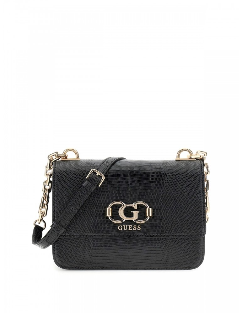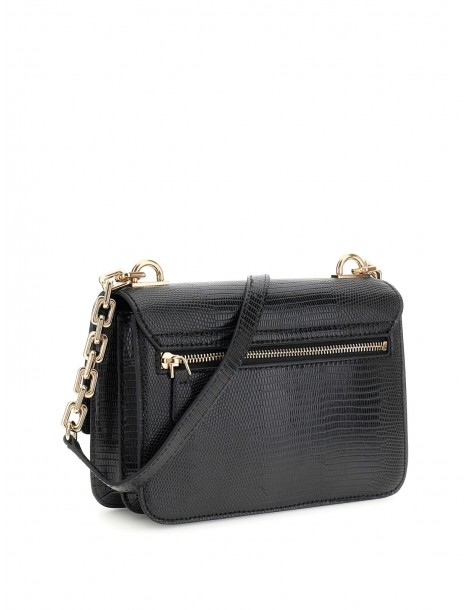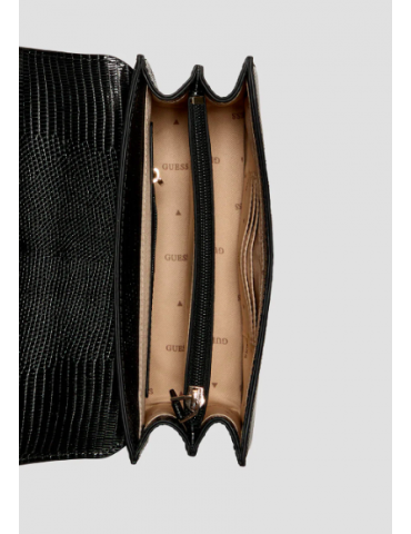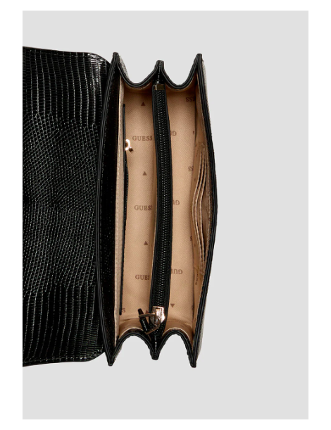Preparati a valorizzare il tuo look con la borsa a tracolla nera Salinge Flap di GUESS. Pensata per una donna giocosa ed elegante, questa borsa presenta una tracolla regolabile, numerosi scomparti per tutti i tuoi oggetti essenziali e una base in PU effetto lucertola per una texture più definita. Le finiture dorate lucide aggiungono un tocco glamour a questa borsa originale e divertente.