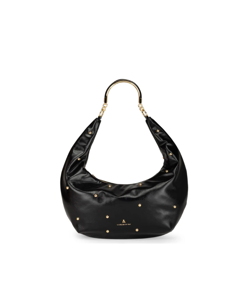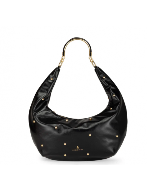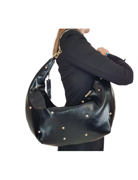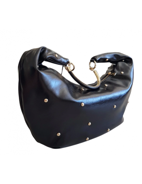 Borsa nera impreziosita da borchiette. È dotata di manico rigido. Chiusura zip. Dimensioni: 43 cm x 30 cm x 12 cm