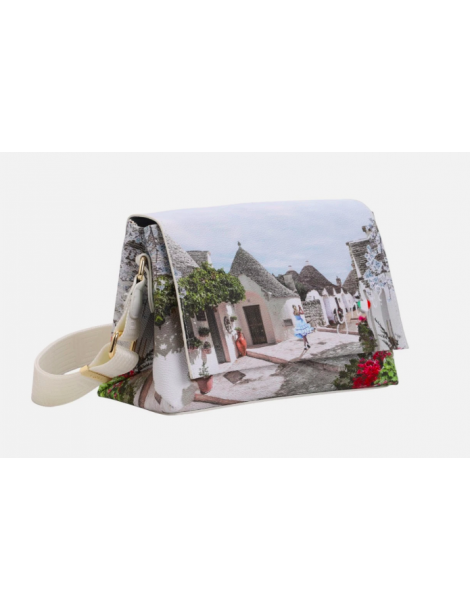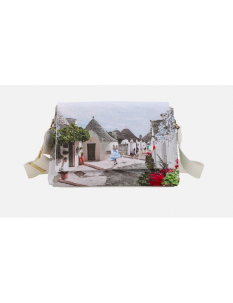 YNot borsa postina stampa Alice in Trulli YES621S3. Flap bag realizzata in ecopelle stampata finitura zigrinata con inserti in pelle, chiusura con patta e bottone magnetico. Due scomparti principali con chiusura zip, una tasca interna con zip, tasche di servizio interne per piccoli accessori. Tracolla a fascia logata regolabile e staccabile, ciondolo portachiavi staccabile. Dimensioni: L 25,00 x P 10,50 x H 17,00