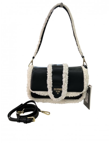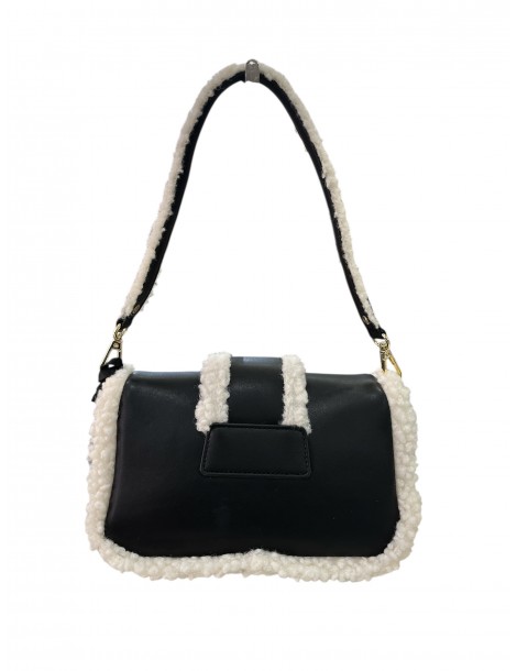 Borsa a spalla in ecopelle ed eco pelliccia con logo color nero. dimensioni 23x15x6