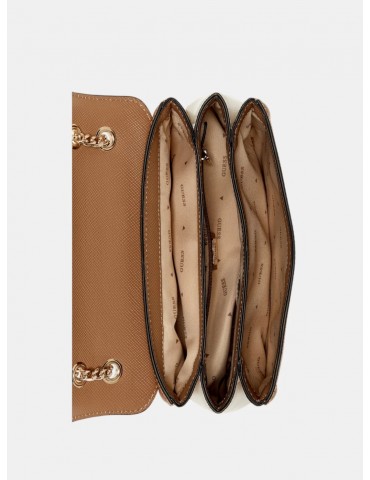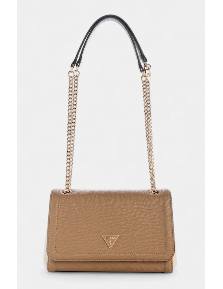 Fai una dichiarazione senza tempo con la borsa a tracolla convertibile Noelle marrone con patta. Realizzata in una classica base in PU saffiano, questa borsa strutturata presenta una silhouette con patta frontale impreziosita da dettagli color oro e dal caratteristico logo triangolare GUESS. Le doppie tracolle in catena e similpelle aggiungono un tocco di eleganza e possono essere indossate a tracolla o a spalla per uno stile versatile. Perfetta per contenere i tuoi oggetti essenziali quotidiani, è il mix ideale di eleganza e funzionalità.