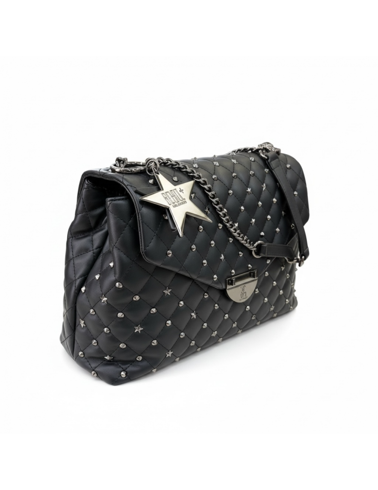 Questa borsa a spalla nera matelassé è il perfetto mix tra eleganza e carattere deciso. Il motivo trapuntato è arricchito da borchie e dettagli a stella, che donano un look moderno e leggermente rock.