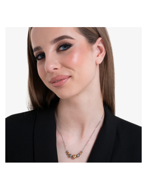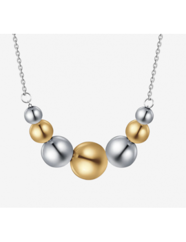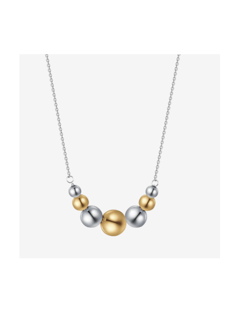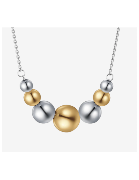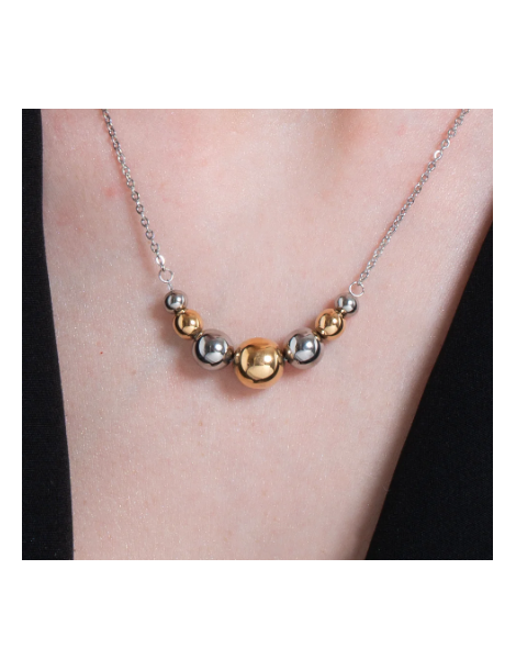 Collana in acciaio con sfere in acciaio ed acciaio IP gold. Lunghezza: 40 + 5 cm Diametro sfere: 10 - 8 - 6 - 5 mm Una collana che gioca con l'alternanza tra sfere in acciaio e IP gold, perfetta per chi ama i dettagli eleganti e versatili. Realizzata in acciaio resistente, è il complemento ideale per completare qualsiasi outfit con classe.