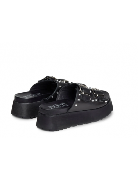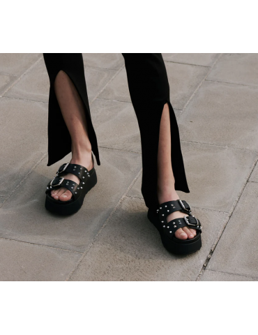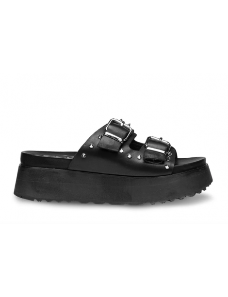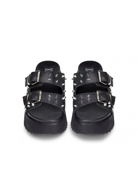 Attuali ma senza mai rinunciare alla propria anima rock questi sandali firmati Cult per l'estate 2025. Due fasce in pelle nera impreziosite da fibbie e borchie spike in metallo e suola platform per questi sandali da abbinare ad ogni outfit per un tocco decisamente glam rock.