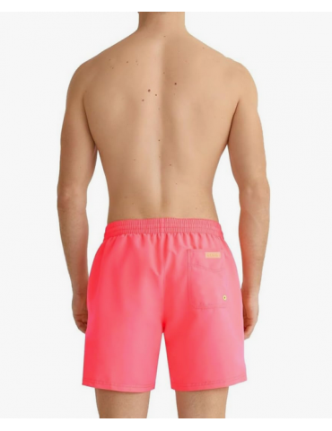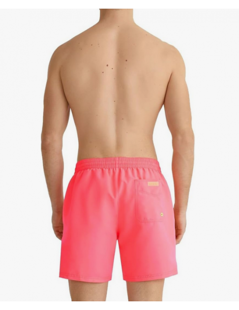 Costume da bagno da uomo fucsia fluoro della marca Guess. Appartiene alla collezione Guess Beach. È di vestibilità classica e ha la vita elastica con coulisse regolabile. Presenta due tasche laterali e una posteriore. Sembra il logo triangolo gommato su una gamba. Lunghezza sopra il ginocchio. Caratteristiche: 100% poliestere, lunghezza esterna gamba: circa 40 cm