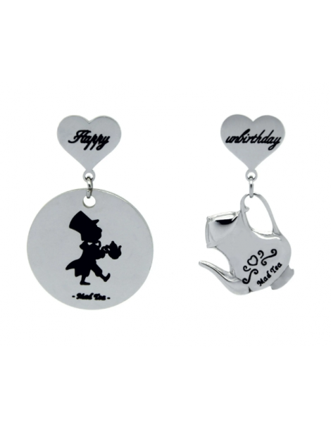 Orecchini asimmetrici con targhetta con incisa la figura del Cappellaio e piccola teiera pendente. Montatura a lobo a forma di cuore con incisa la scritta “Happy” in uno e “Unbirthday” nell’altro (traduzione: buon non compleanno).