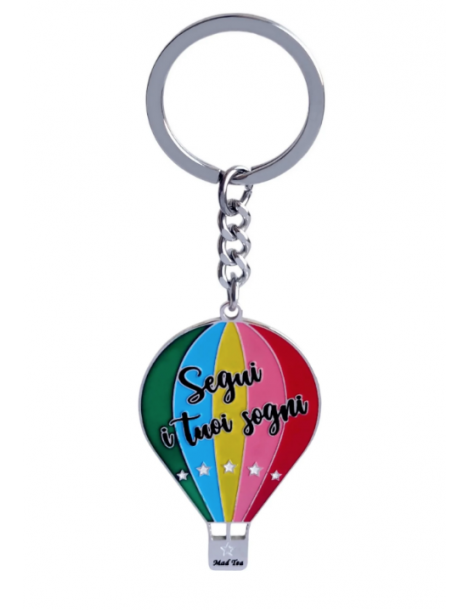Portachiavi con mongolfiera colorata con incisa la frase “Segui i tuoi sogni”.