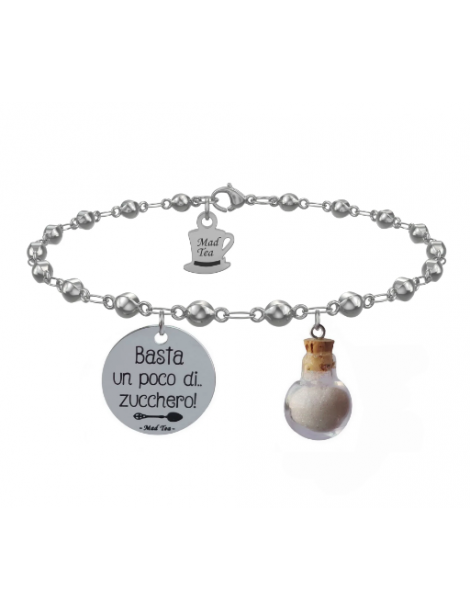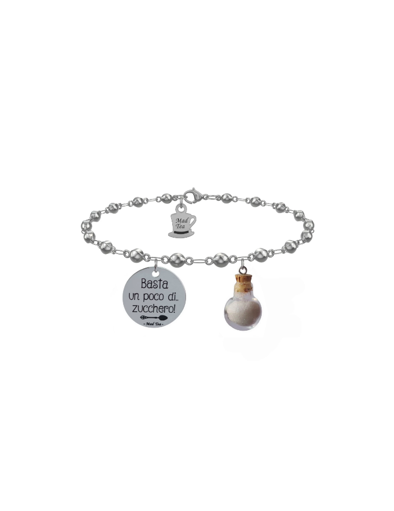 Bracciale composto da targhetta con incisa la frase “Basta un poco di zucchero” con un piccolo cucchiaino inglese e simpatica boccetta contenente lo zucchero magico.