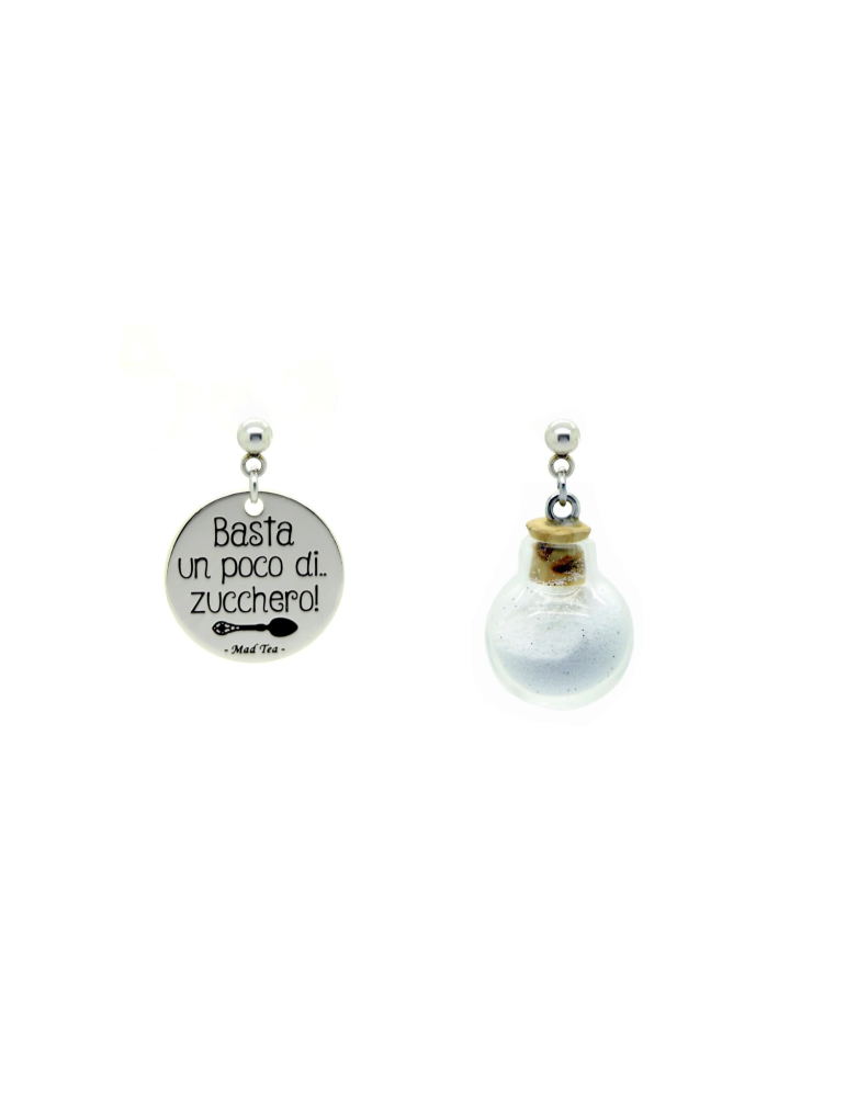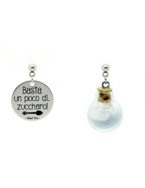 Orecchini composti da targhetta con incisa la frase “Basta un poco di zucchero” con un piccolo cucchiaino inglese e simpatica boccetta contenente lo zucchero magico