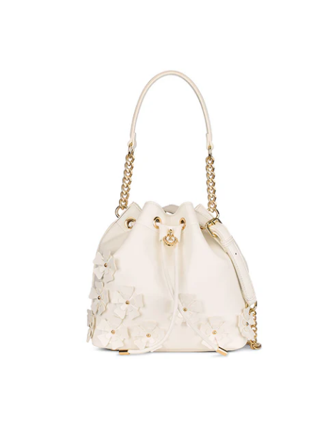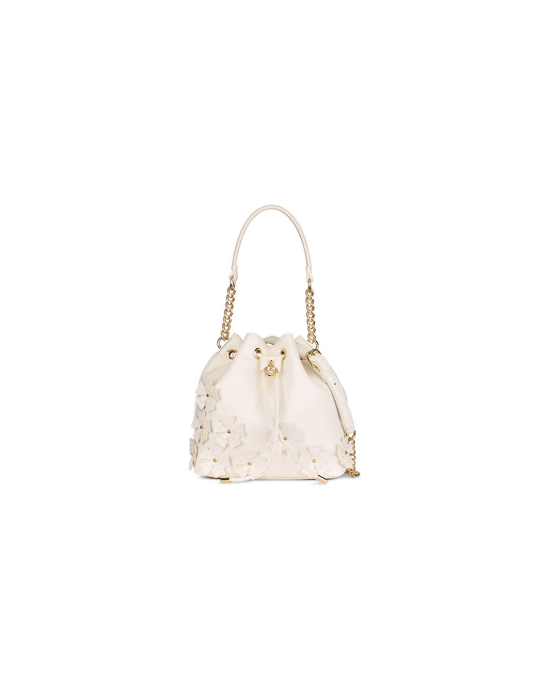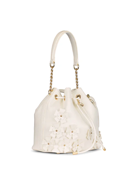 Borsa a secchiello con applicazioni floreali impreziosita da charm a forma di cuore con logo L'Atelier du Sac. È dotata di manico in catena ed ecoleather e tracolla regolabile in ecoleather. Chiusura magnete. Chiusura con coulisse
