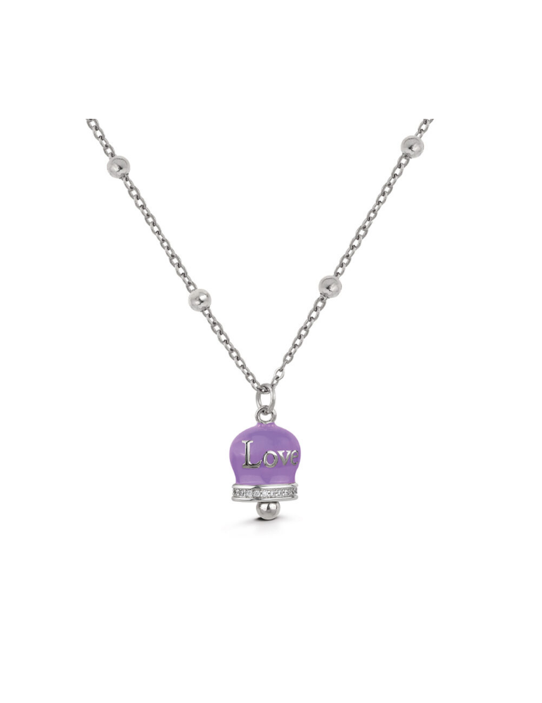Collana in acciaio lucido con trattamento PVD oro giallo. Pendente a forma di campanella con cristalli e smalto bianco, nero, rosa, fucsia, azzurro e viola. Personalizzata OPS!. Lunghezza regolabile da 40 a 45 cm.