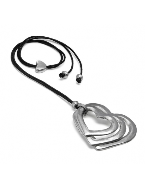 Pendente filo con 3 ciondoli a forma di cuore. Modello regolabile. Misura del cuore più grande 7,5 cm circa. Realizzato a mano in alluminio 100% riciclato. Nickel tested. Lavorazione artigianale. Gioielli fatti a mano, unici e artigianali, perfetti per tutti i tuoi look o come idea regalo. Le misure indicate possono essere soggette a piccole variazioni date dall'artigianalità del prodotto.