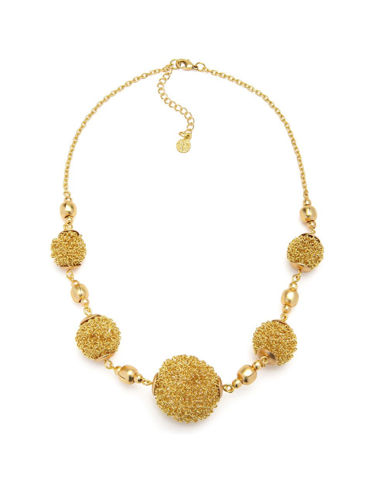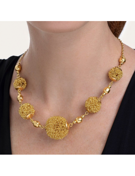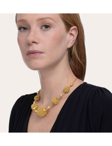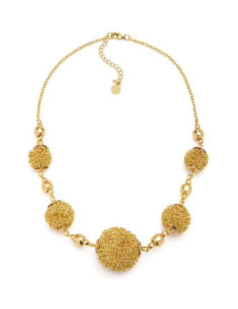 Collana catena in ottone decorata con 5 sfere di microfilo tessuto a mano. Le sfere hanno dimensioni diverse donando ai look un effetto dinamico e luminoso. Lunghezza catena 45 cm. Lunghezza extra chain 6,5 cm. Chiusura con moschettone regolabile. Il design della collana è artigianale e leggero, da abbinare alle tue preferite per un effetto multilayer. Nickel tested. Gioielli fatti a mano, unici e artigianali, perfetti per tutti i tuoi look o come idea regalo.