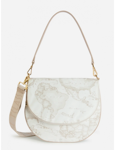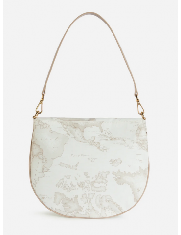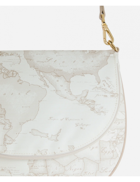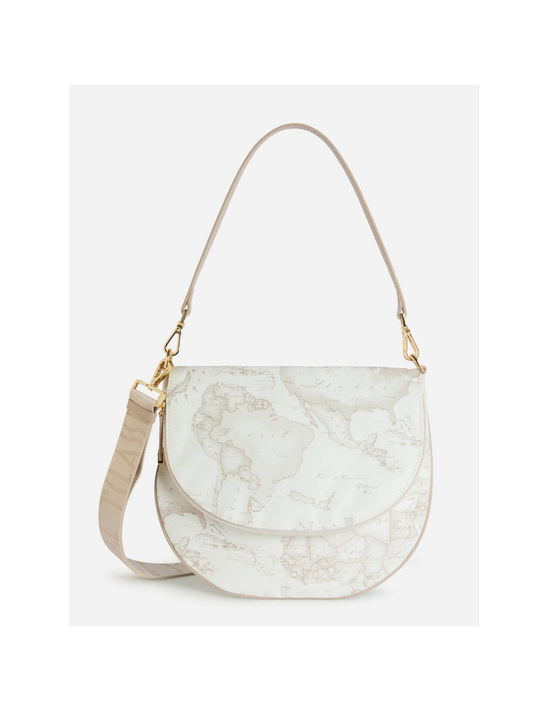 La sottospalla con patta sposa perfettamente l'attitude rilassata e funzionale del tessuto soft: il vano principale è chiuso con magnete dalla patta con zip, che a sua volta consente l'accesso al vano posteriore della borsa. Lo spallaccio e la tracolla regolabile in nastro sono entrambi rimovibili per consentire la doppia portabilità, mentre la stampa Geo White è abbinata al piping in eco-pelle color Nude: versatilità e carattere in un modello che accompagnerà ogni momento della tua giornata.
