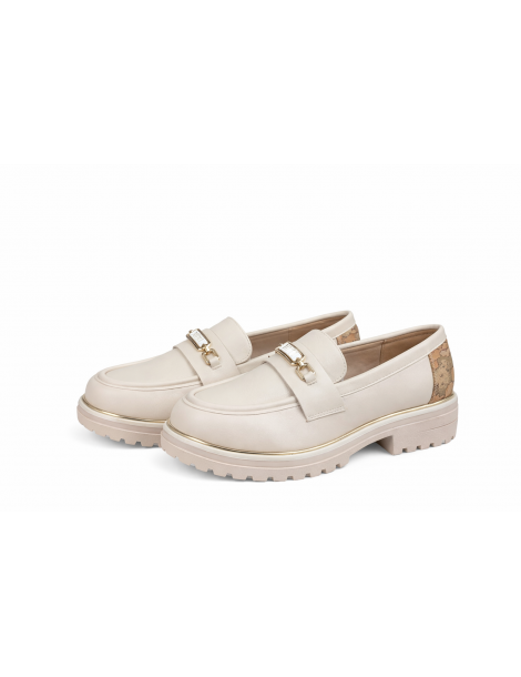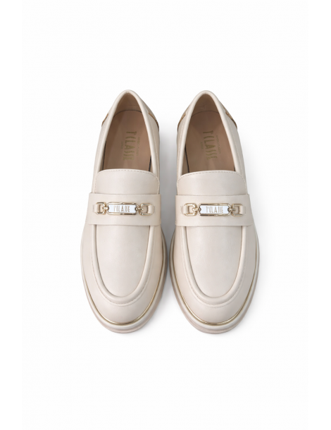 Eleganza contemporanea e comfort quotidiano si incontrano in questi raffinati mocassini platform da donna. Realizzati in morbida similpelle color panna, si distinguono per il design essenziale impreziosito da un elegante morsetto decorativo in finitura oro lucido sul davanti.